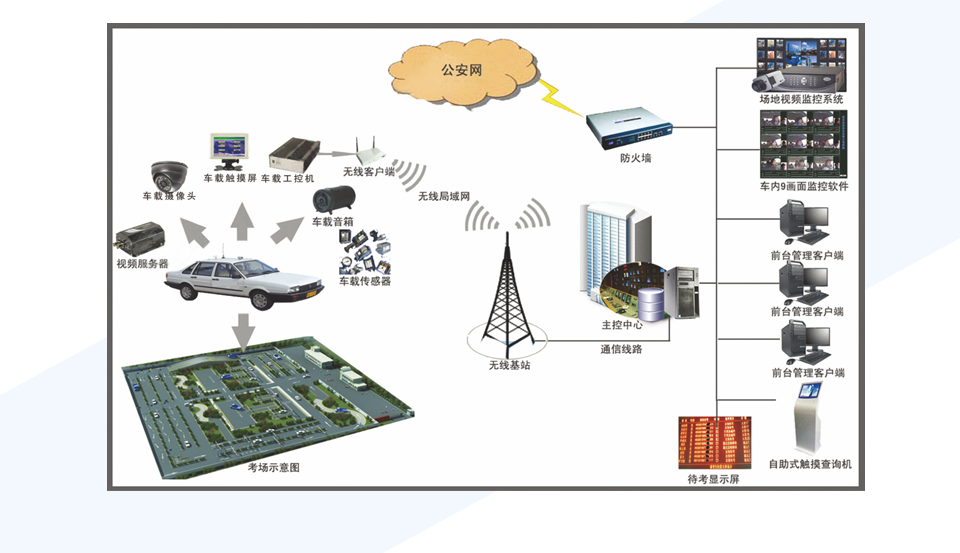 根據(jù)考試過(guò)程的實(shí)際需求,系統(tǒng)集成了信息顯示、語(yǔ)音公告、車(chē)載視頻監(jiān)控、道路測(cè)繪、GPS差分基站、信號(hào)燈和無(wú)線(xiàn)網(wǎng)絡(luò)傳輸?shù)认到y(tǒng)。